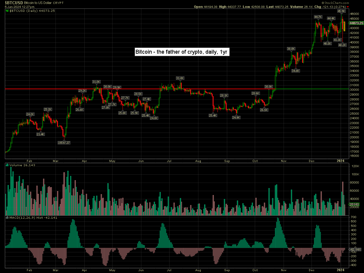 Bitcoin is -0.3% at $44073. Daily momentum prone to turning positive this weekend.