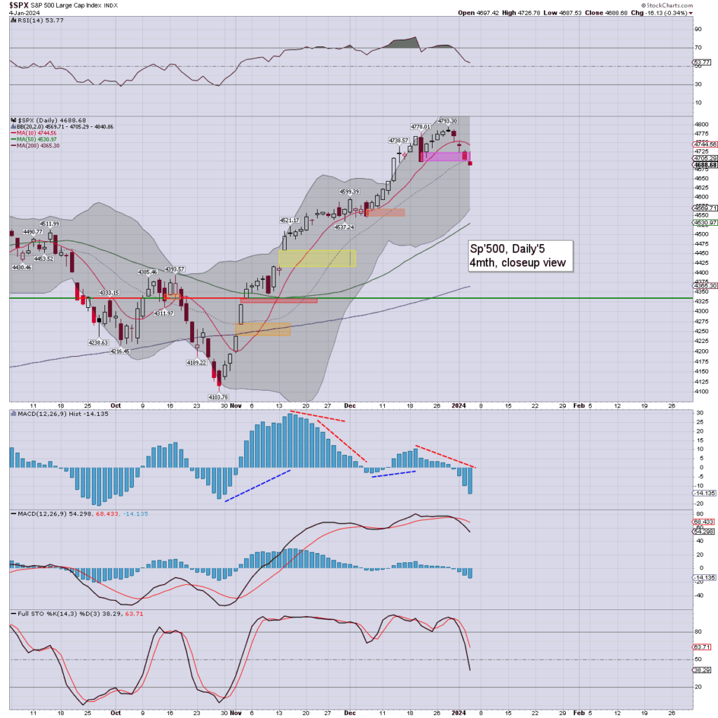SPX: initial cooling to 4696, with a moderate upswing to 4726. The late afternoon saw renewed cooling, a fourth day lower, settling -0.3% to 4688. Momentum is increasingly negative, with no sign of a floor/turn.