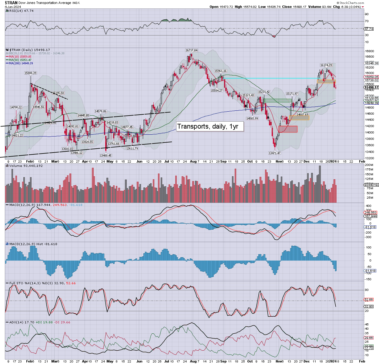 Trans: a sixth consecutive net daily decline, settling -0.04% to 15498. Today’s candle is a hollow red reversal, and leans s/t bullish.