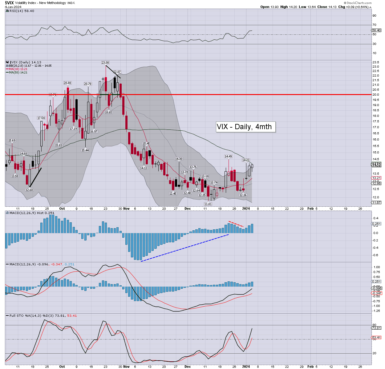 Volatility was muted, the VIX settling +0.6% at 14.13. Momentum ticked upward for a third day, and is on the moderately high side.