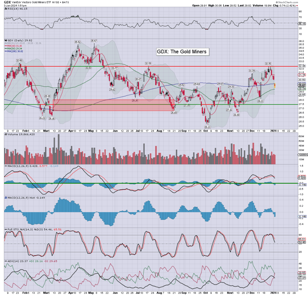 US equities remain moderately lower. Meanwhile, the precious metals are sig’ lower, Gold -$20 (1.1%), with Silver -2.9%. The miner ETF of GDX is currently -2.4% at $29.82.
