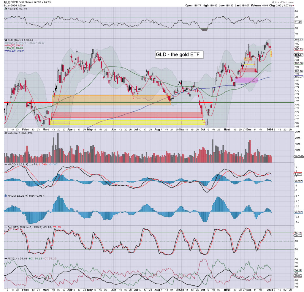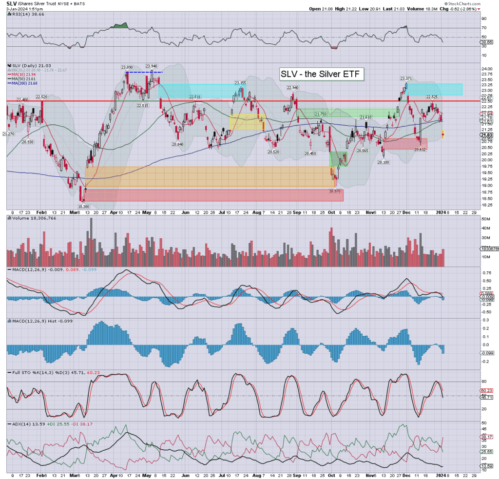 Silver/SLV: silver printed $23.05, pressured by the main market, and the dollar. An eventual push >$30 looks feasible this year, and the cautious will wait to chase until that is printed.