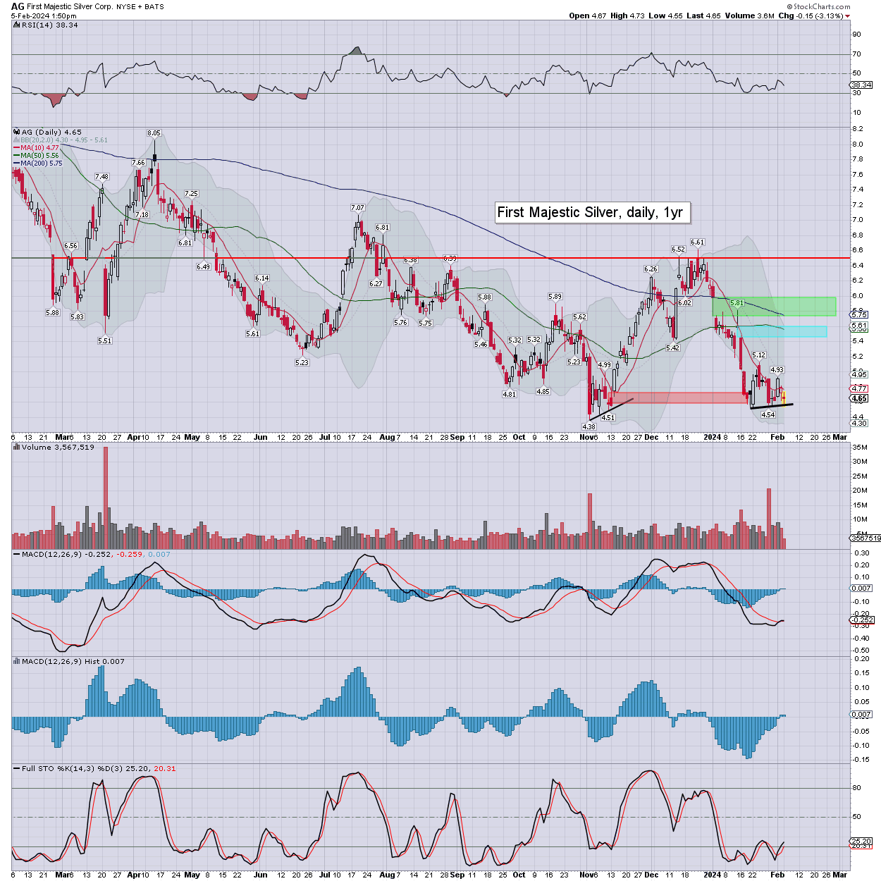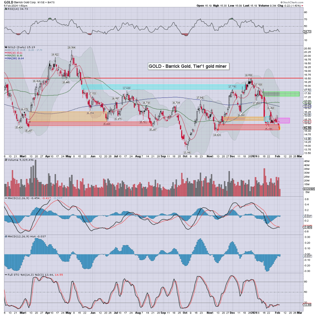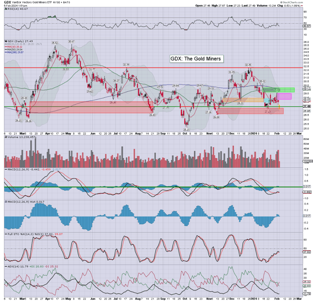 GDX: miners lower with gold/silver, if mostly holding above recent lows.