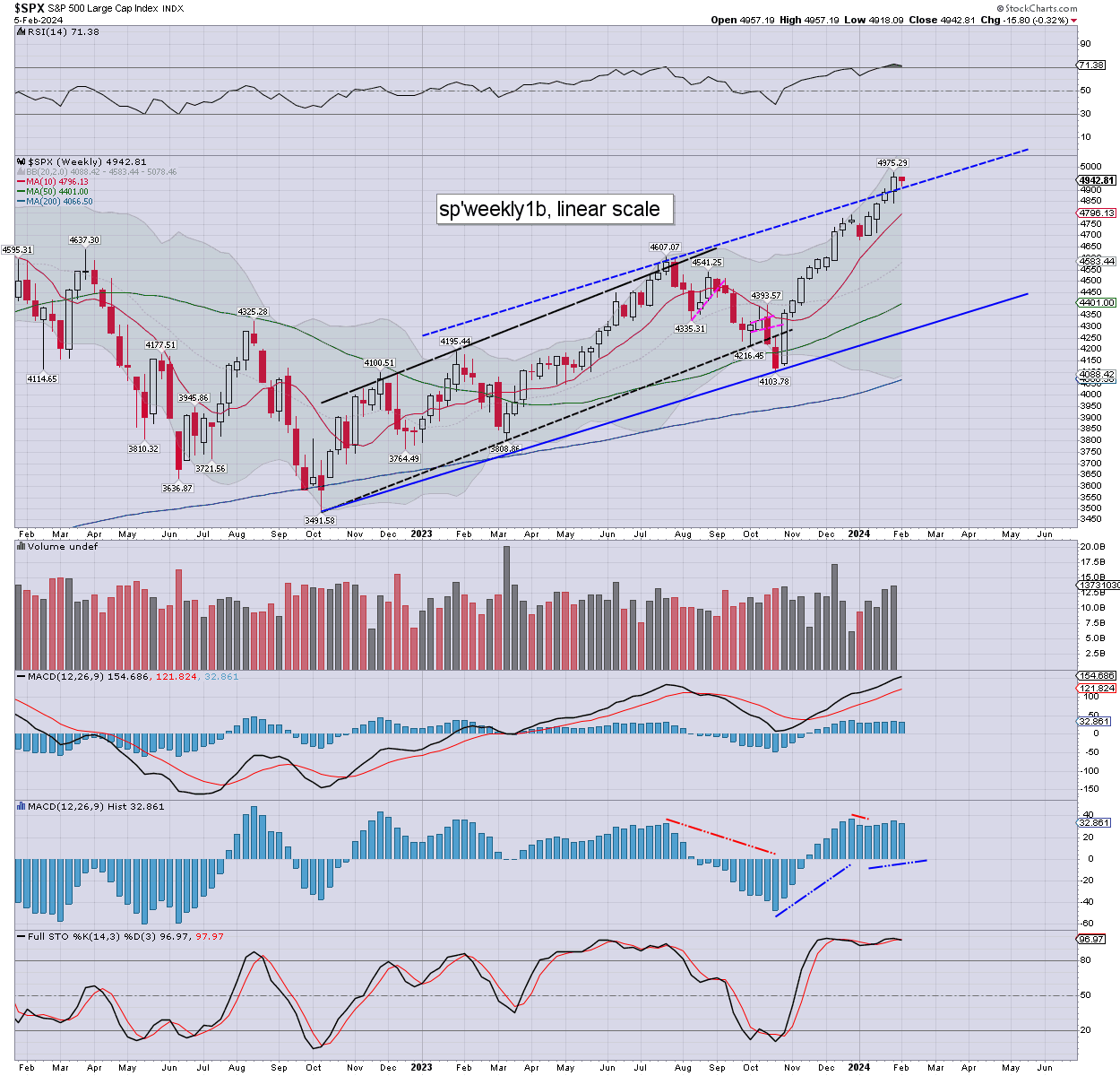 SPX: last week’s break above upper channel/trend I see as significant. I can’t take ANY cooling seriously, unless we break and hold under the weekly 10MA (4796), and that doesn’t appear realistic any time soon. Upper weekly bollinger has climbed to 5078.