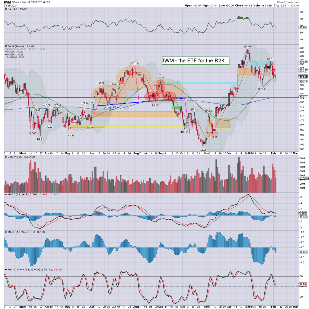 R2K: the fourth day lower of five, settling -1.3% to 191.88. Friday’s reversal candle failed to play out. Momentum ticked lower, and is on the moderately low side.