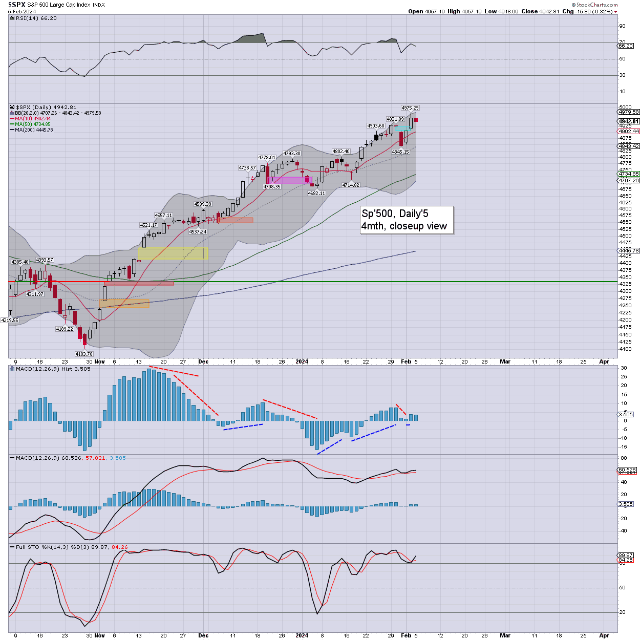 SPX: an early low of 4918, bouncing to 4956, and settling -0.3% to 4942. Momentum subtly ticked lower, and remains marginally positive. Upper bollinger has climbed to 4979, and will be offering giant psy’ 5K within 2-3 days.