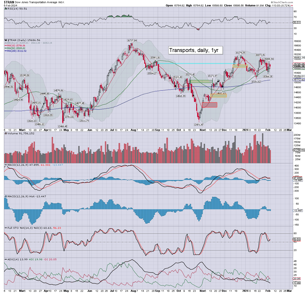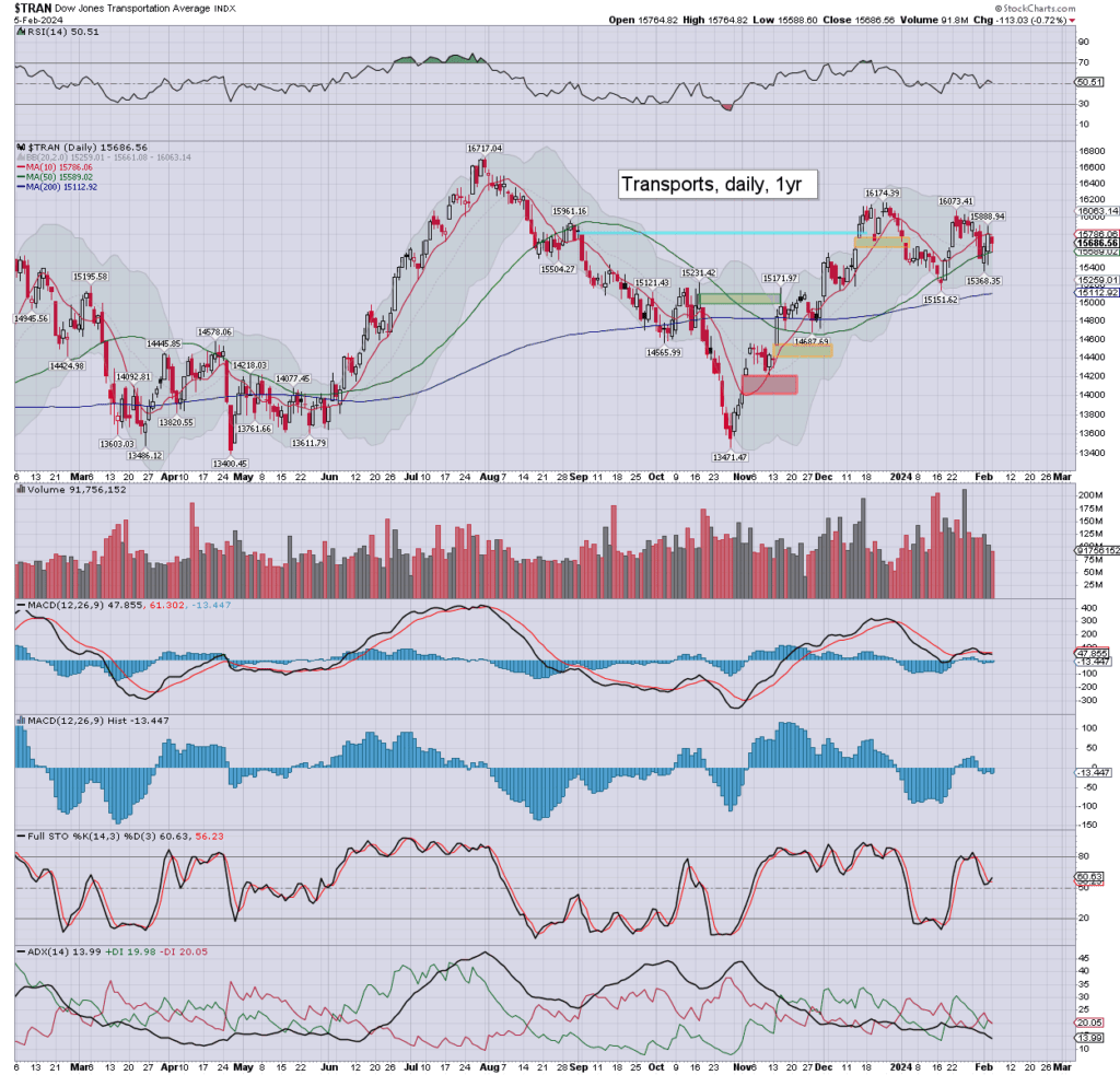 Trans: settling -0.7% to 15686. Today’s candle is spiky on the lower side from the 50dma. Momentum remains marginally negative.