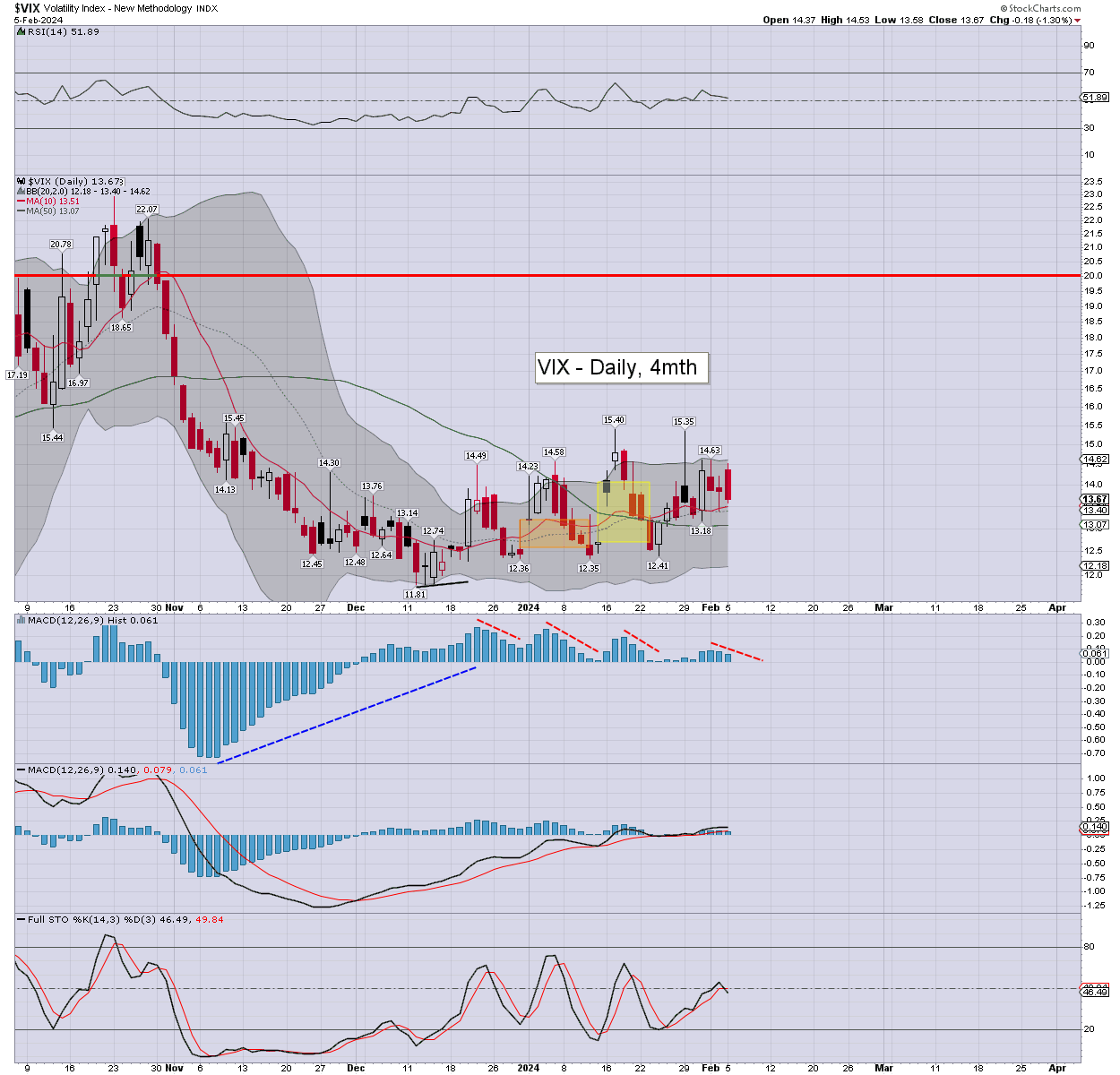 Volatility was a little mixed, the VIX printing 14.53, if cooling back to settle -1.3% at 13.67. Momentum ticked lower, and will be prone to turning negative within 1-2 days. The key 20 threshold looks out of range until at least late March.