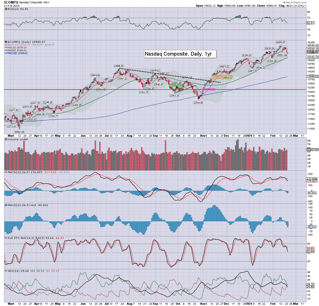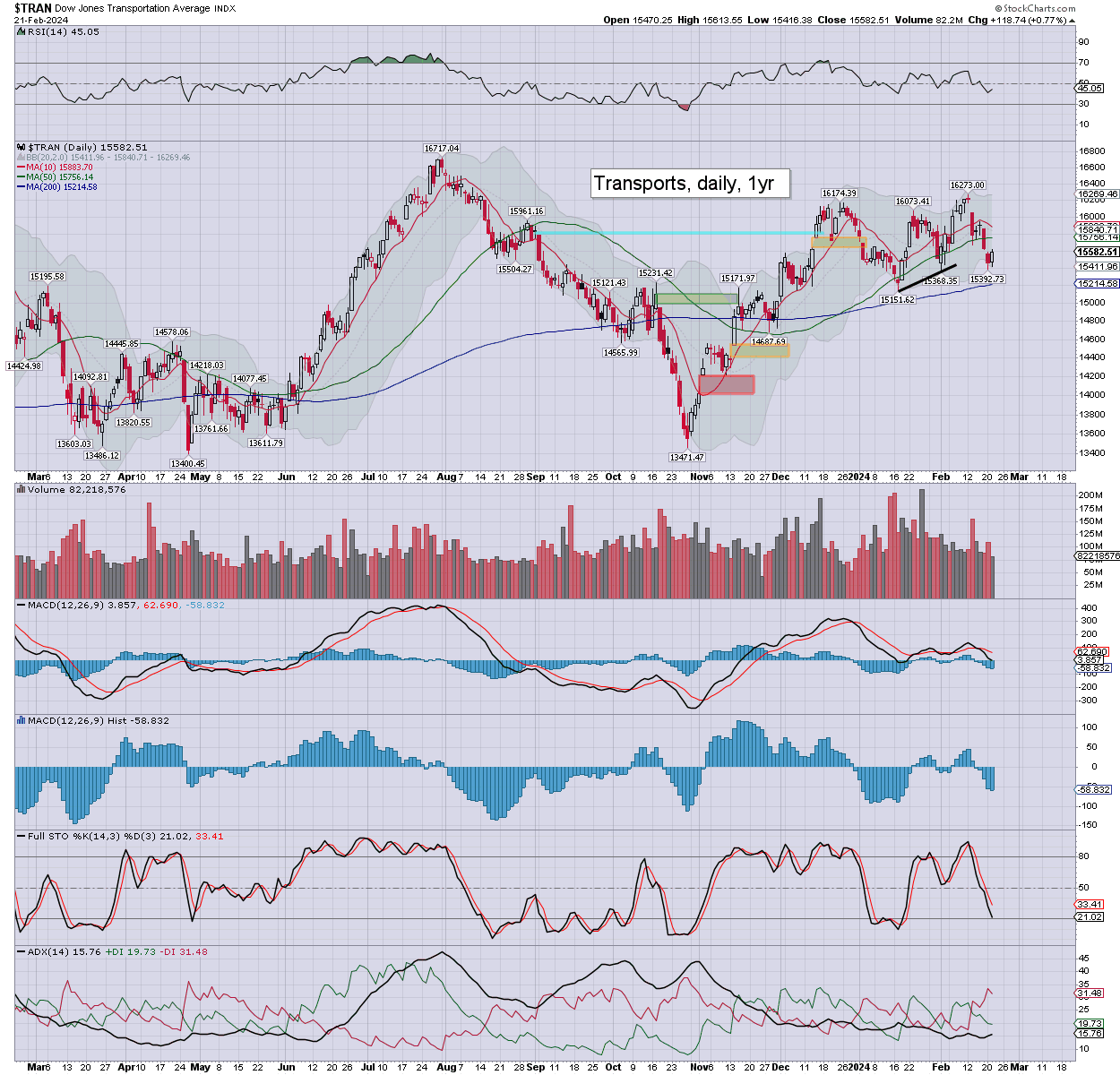 Trans: settling +0.8% to 15582. Momentum is on the moderately low side, as the setup favours the bulls into early March.