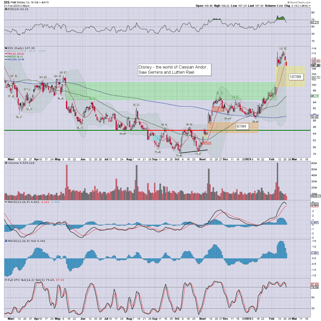 Disney lower for a third day. Gap tagged. Momentum due to turn negative on Thursday, not least if SPX is -1%.