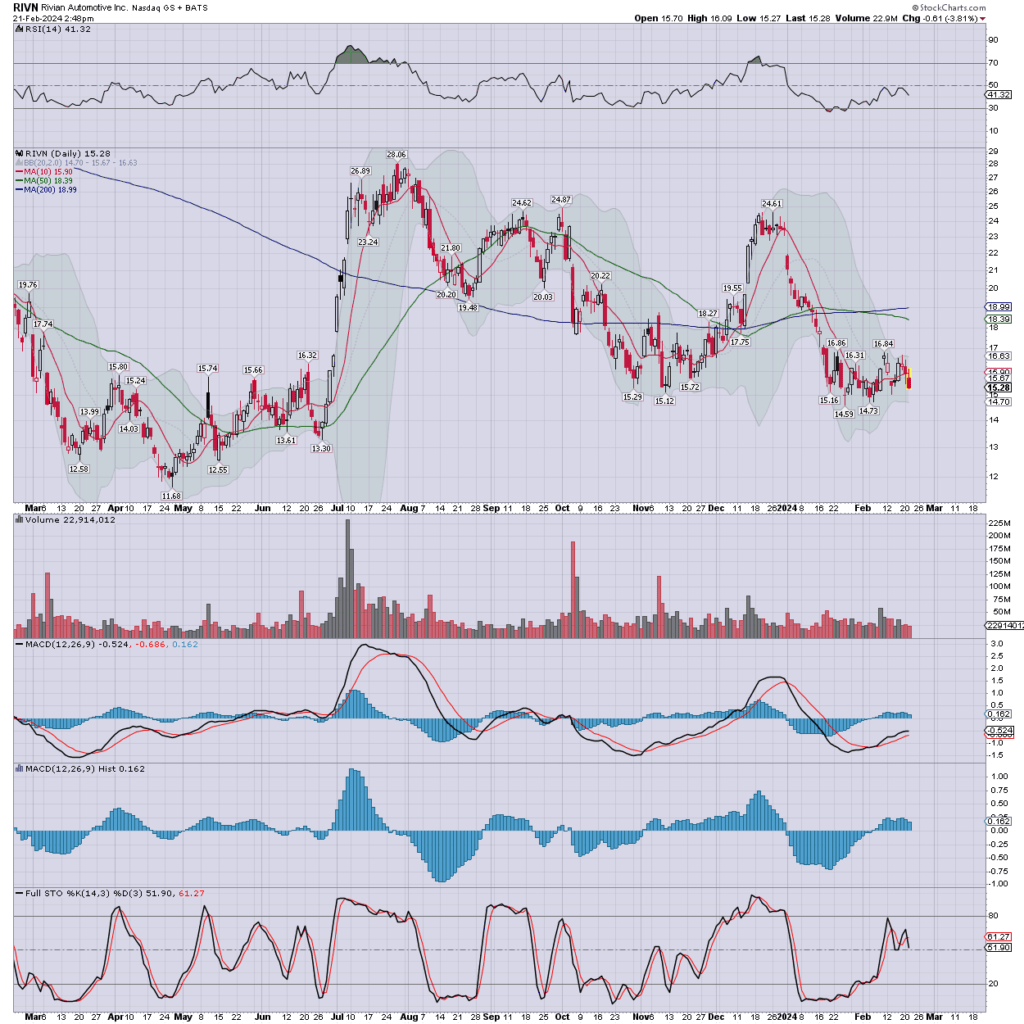 Rivian Automotive has earnings in AH. The vehicles look nice, but the company is struggling, and I don’t see this as having a l/t future.