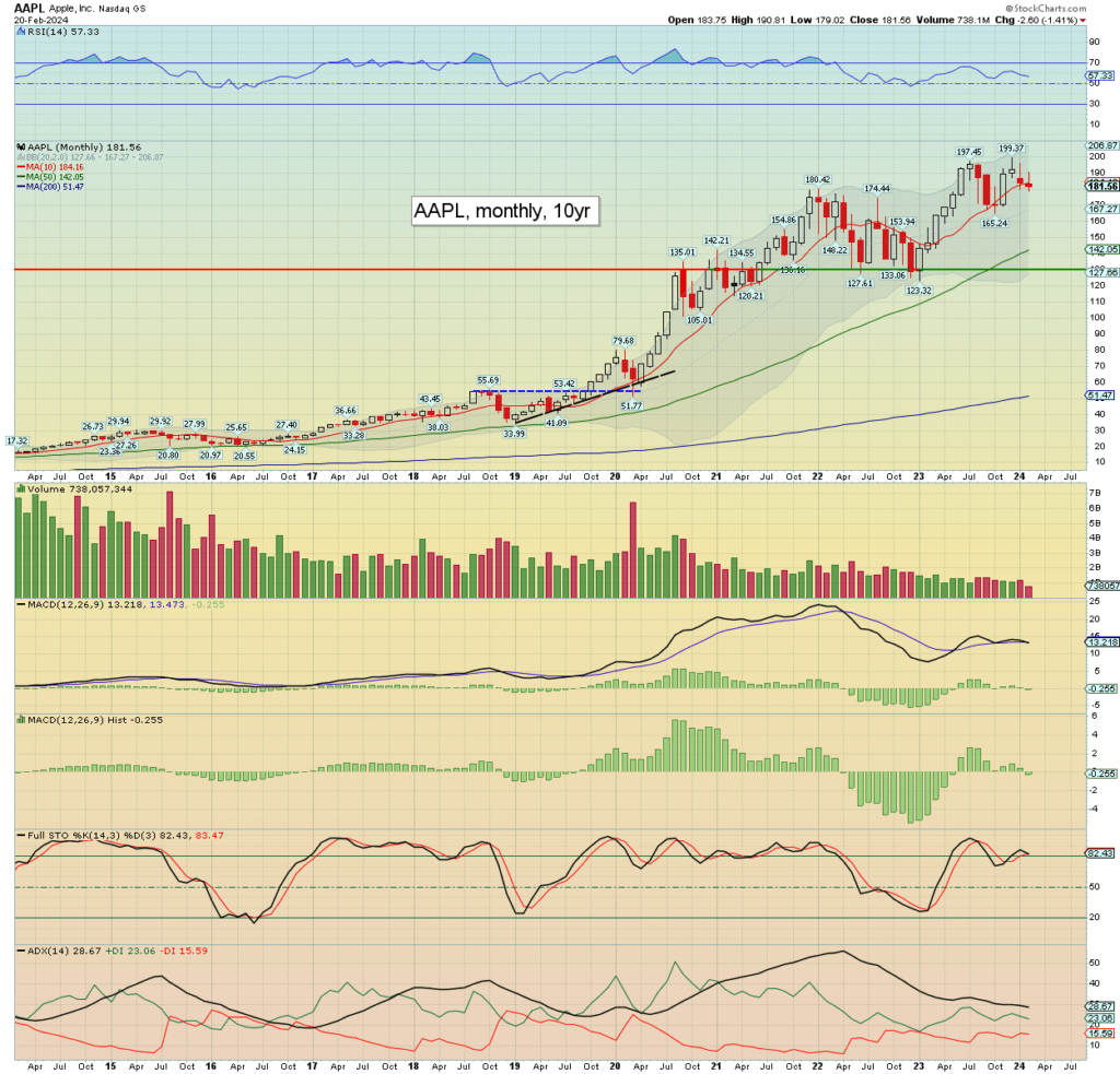 Apple stands at $181.56. Monthly momentum has turned negative, as big tech is struggling, if less problematic than the semicons.