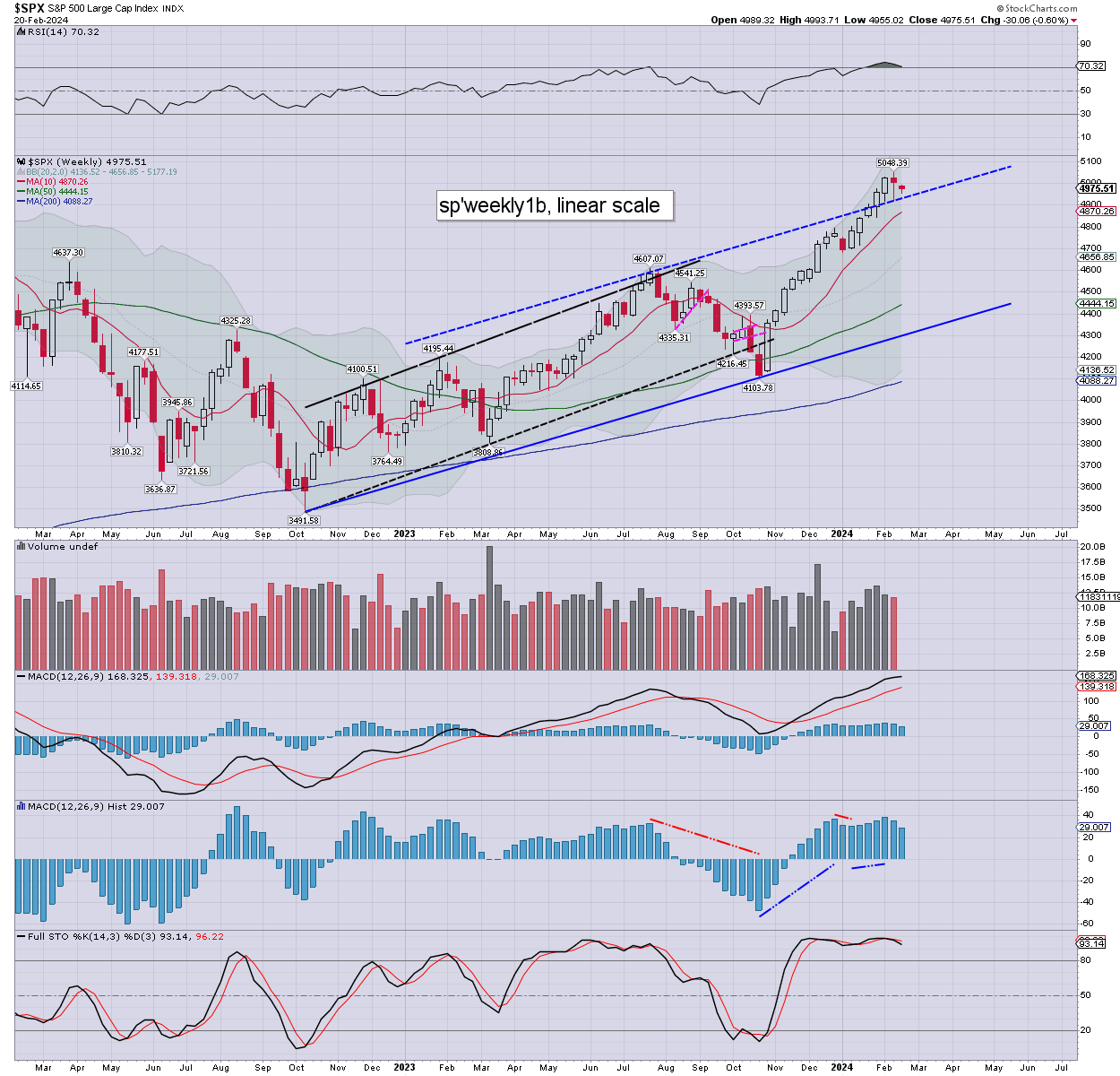 SPX: we’re only a day into the short week, but still… this week’s candle looks tiny… given a few months of perspective. I’d note the weekly 10MA at 4870 which should remain settled above this week… and into March. Upper bollinger has climbed to 5177, as more of the mainstream are seeking the 5200s this spring.