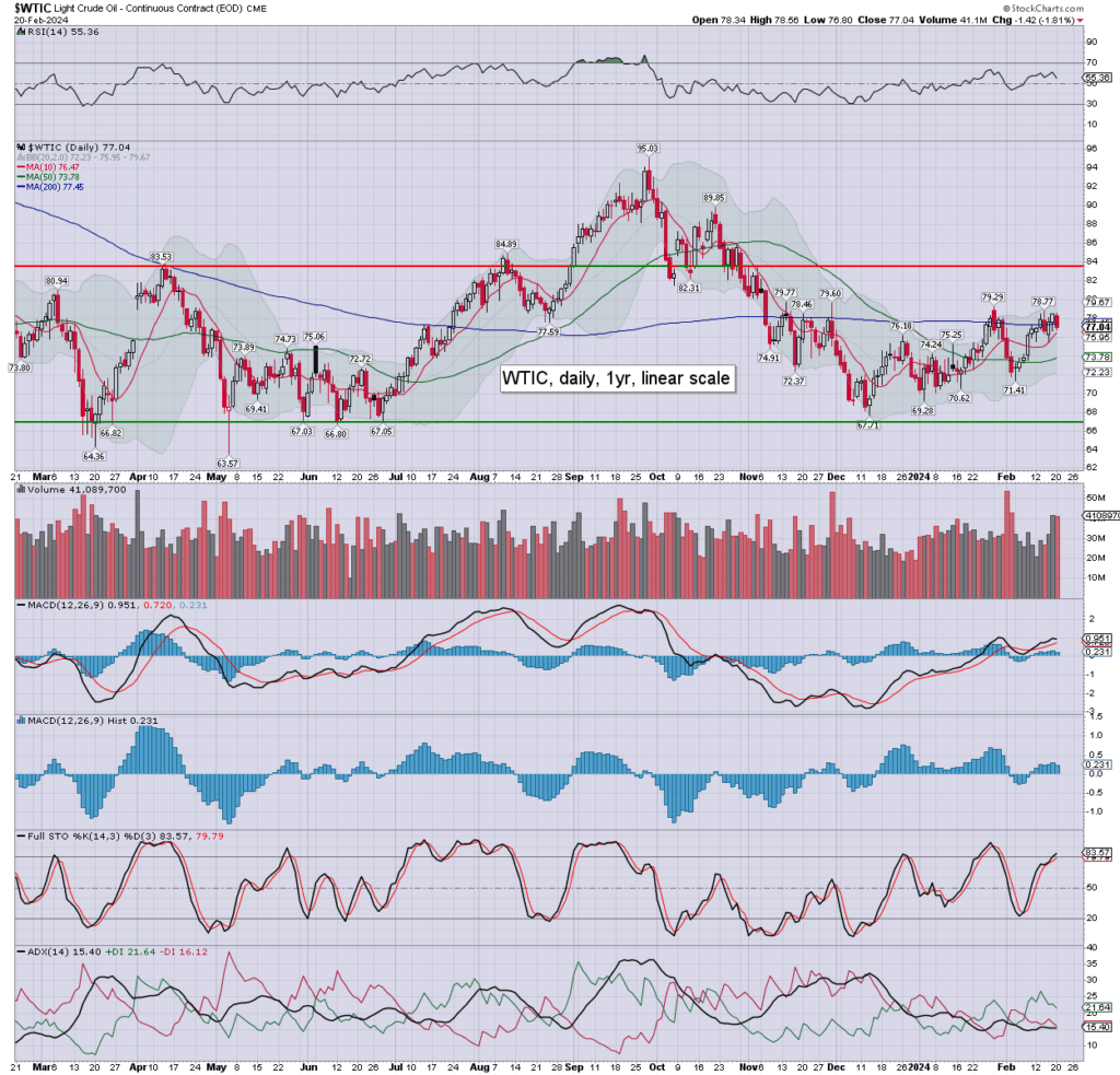 WTIC: oil printed $78.56, but settled at $77.04. Tuesday’s candle is bearish engulfing, and leans s/t bearish, if only another day or two. Last Friday’s close >$78 is more important, and offers the 83/84s within 2-3 weeks.