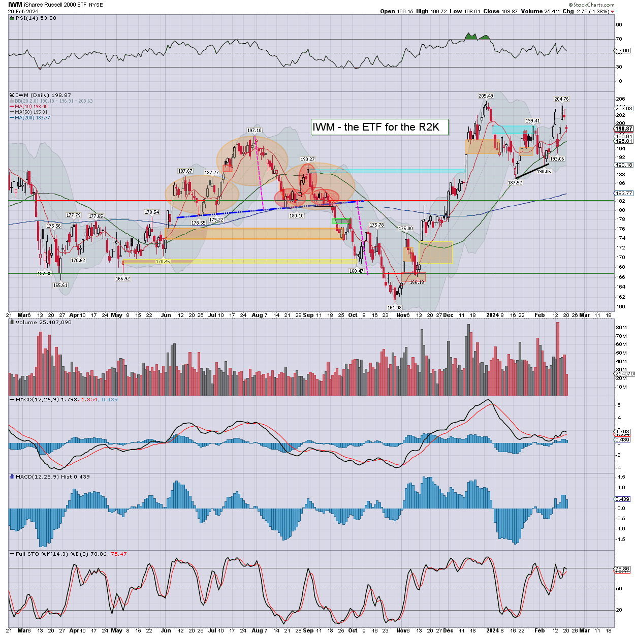 R2K: a second day lower, settling -1.4% to 198.87. S/t bearish, if only another day or two. I have to still expect the 205s to be cleared, and onward to 225.