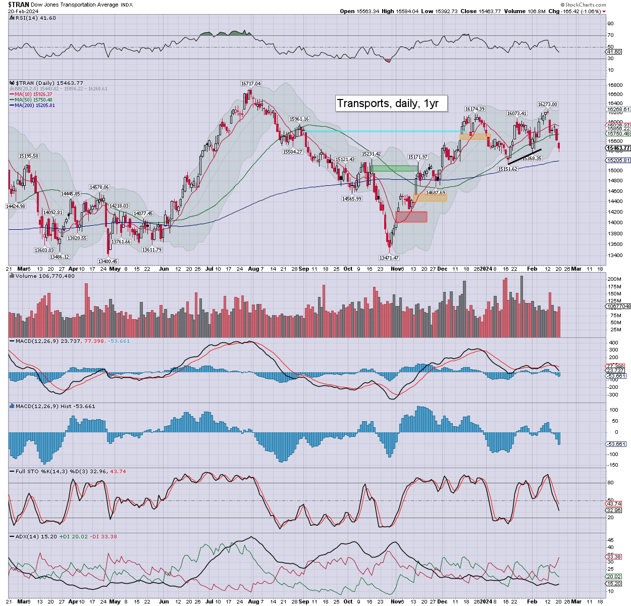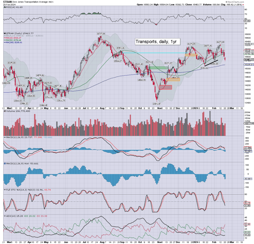 Trans: the fourth day lower of six, settling -1.1% to 15463. Momentum ticked lower, and is on the low side. I’d note the 200dma in the 15200s.