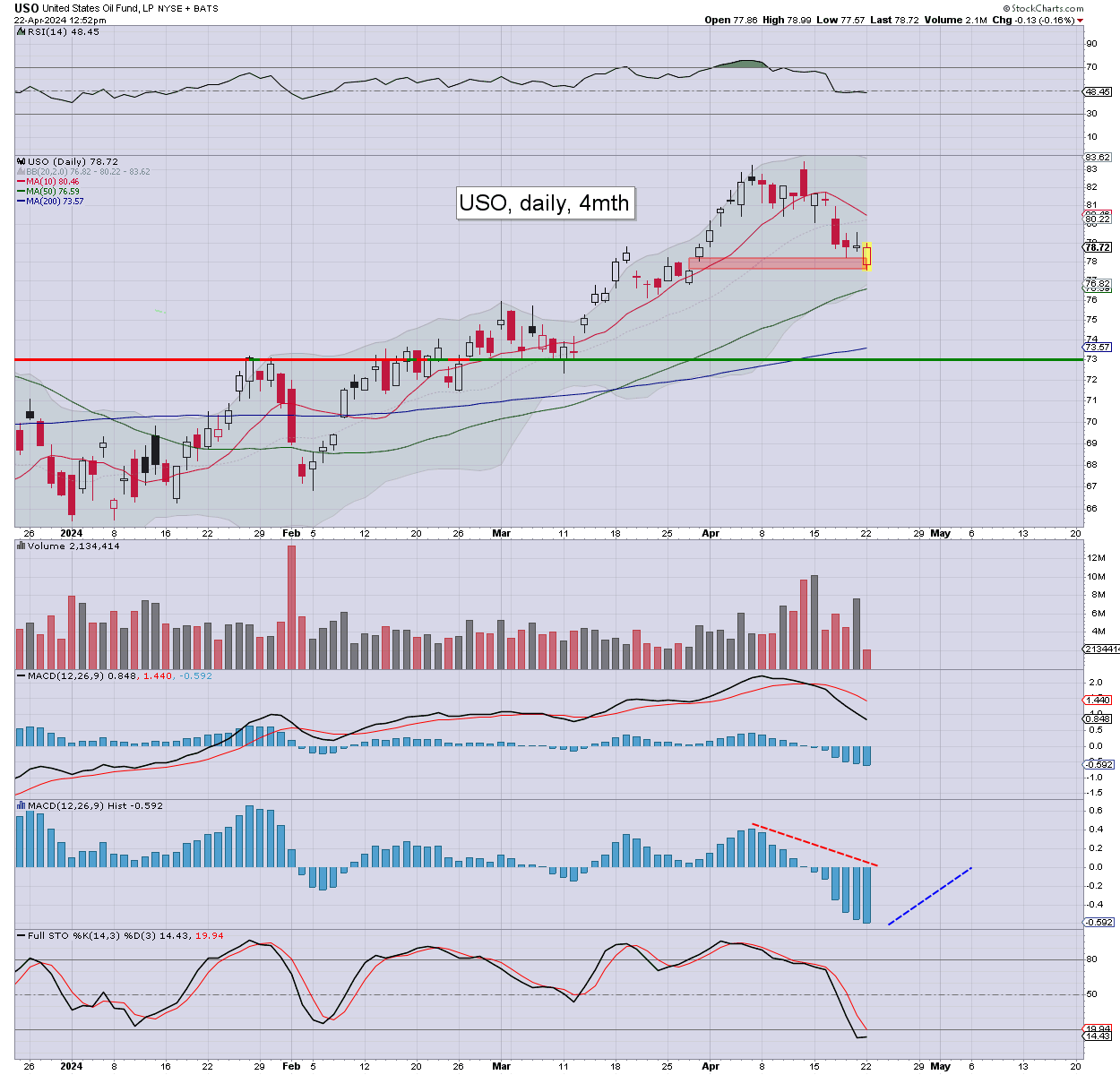 WTIC/USO: oil printed $80.70, if rebounding to the $82s. USO appears due to settle with a hollow red reversal candle… or outright positive. Daily momentum due to offer a cyclical floor/turn.