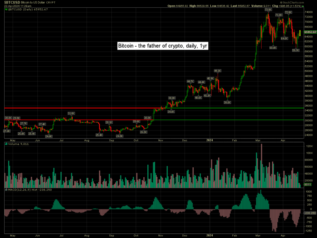 Bitcoin is currently +1.5% at $65952. Daily momentum due to turn positive on Wednesday.