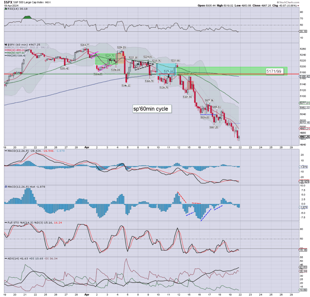 A bounce to the upper hourly bollinger – currently 5062 (if declining) appears realistic early Tuesday, before resuming lower. I’d keep in mind the bigger weekly charts are still going to be increasingly negative, and will be a restraint on all bounces into early May.