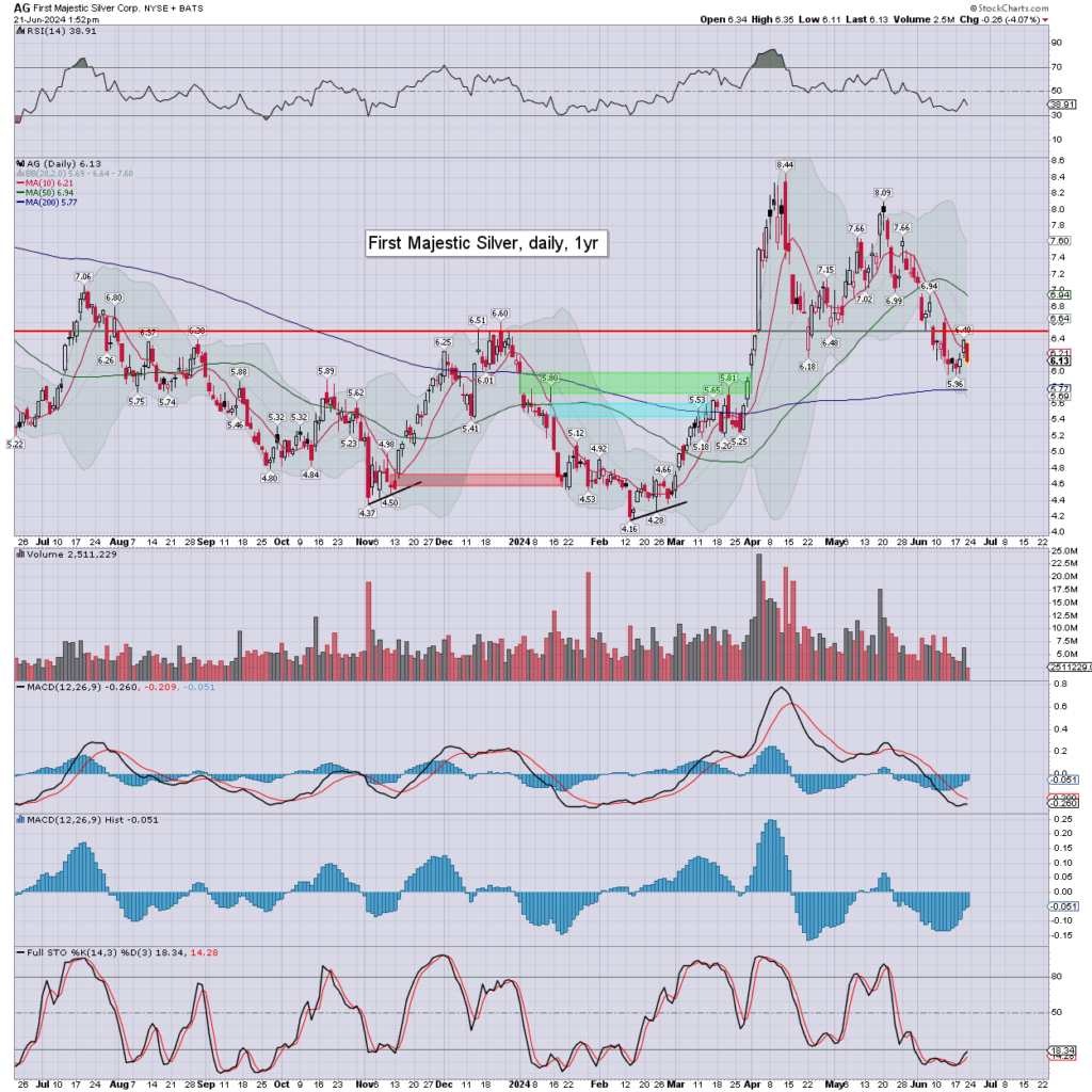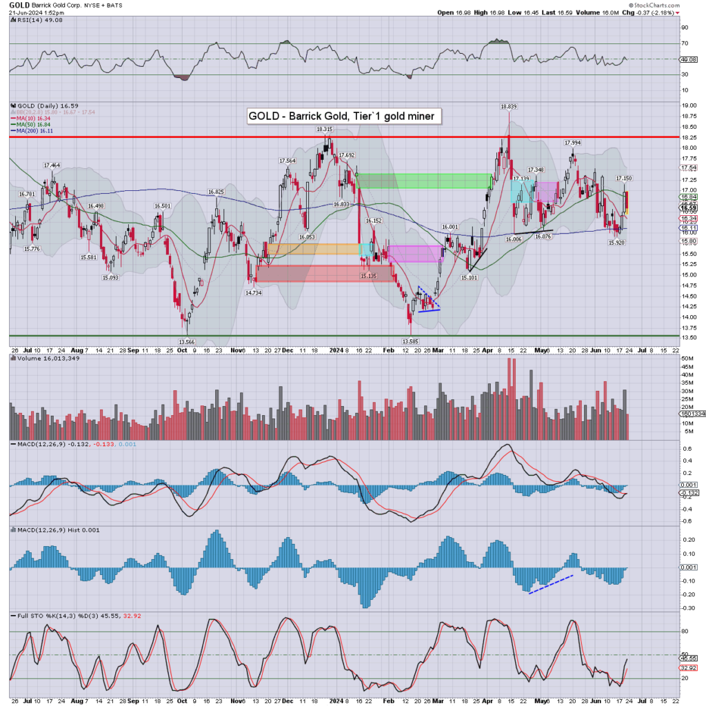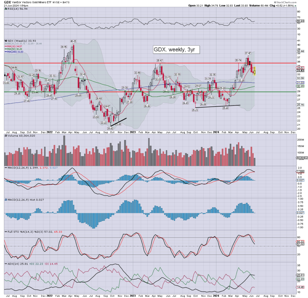 GDX: miners lower with gold/silver. Set for a net weekly gain of around +1.6%.