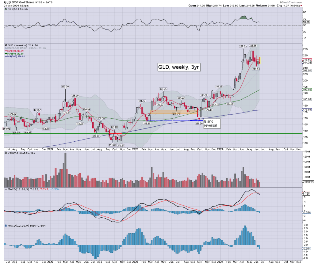 Gold/GLD: gold printed $2330, partly pressured by marginally higher bond yields, and a slightly stronger dollar. Set for a net weekly decline of around -0.6%.