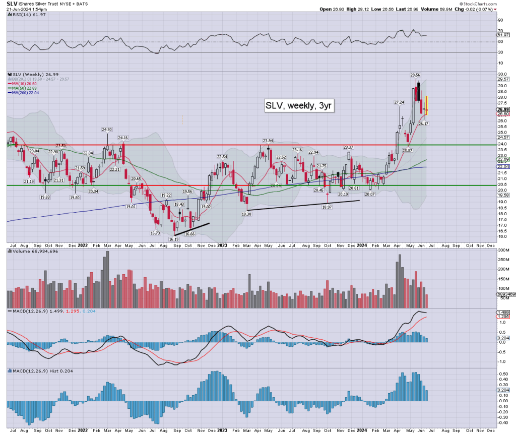 Silver/SLV: silver swung from an overnight high of $30.91 to $29.58. Set for a net weekly decline of around -0.1%.