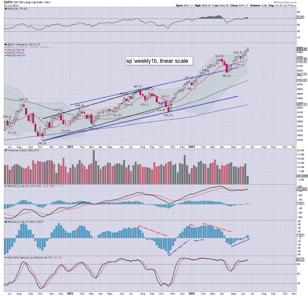 SPX: as things are, we’re net higher for the short week by +41pts (0.8%). Weekly momentum is ticking upward, and will likely continue upward for at least another 2-3 weeks.