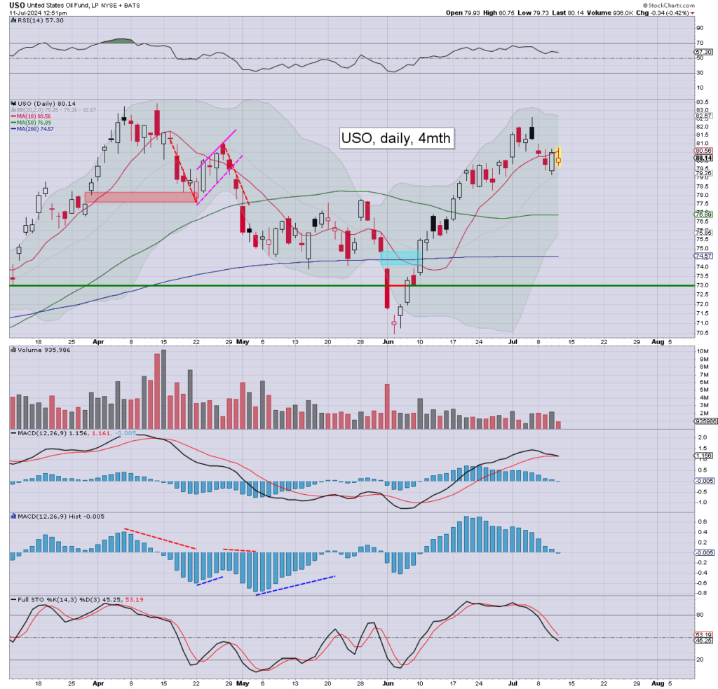 WTIC/USO: oil printed $81.63, if recovering to the mid $82s. Today’s weaker dollar is helping. Soft resistance 84/85. The middle east remains a monstrous threat, as a hyper spike >$100 is an eventuality.