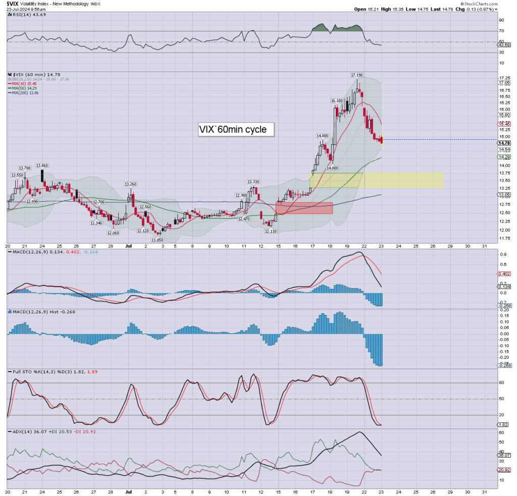 US equities open a little choppy, if mostly leaning upward. VIX appears set to be ground lower into the afternoon, with natural target of yellow gap. WTIC $77.14. Gold $2403. Silver $29.18. Copper printed a new s/t low of $4.13.