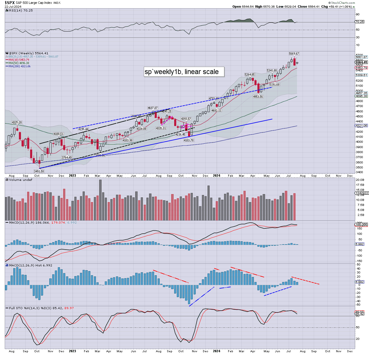 SPX: a sig’ bounce, but after last week’s bearish engulfing (weekly) candle, I have to see it as a bounce. Further, I have to look for another swing lower to take out last Friday’s low of 5497… at least to print the 5450s or so. Weekly momentum continues to weaken, and might turn negative next week.