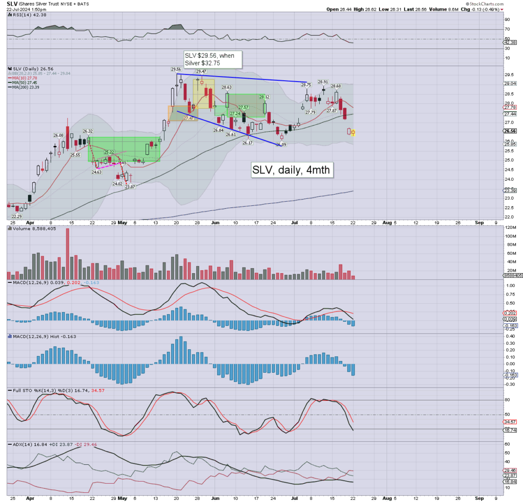 Silver/SLV: silver printed $28.93… a lousy perform’ relative to the positive main market. Assuming the main market has put in a pre-election high, silver appears vulnerable, and unlikely to break >$32.75. Further, any geo-political shocks would see Gold benefit more.