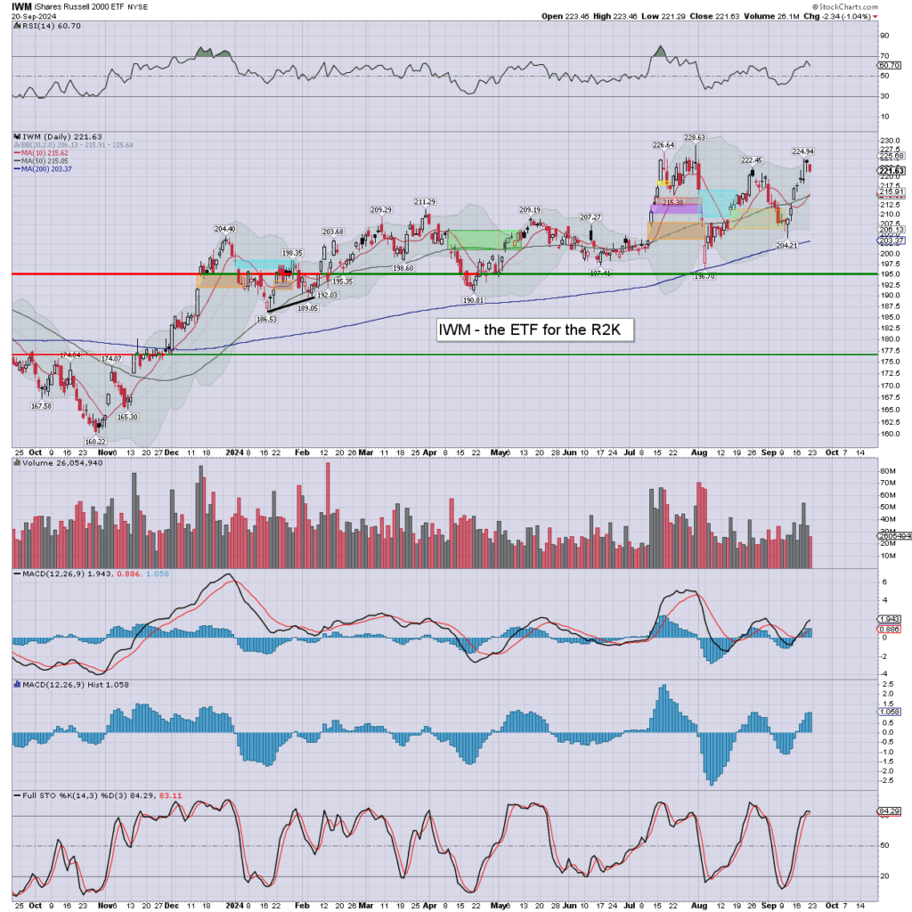 R2K: settling -1.0% to 221.63. Thursday’s black candle played out. Momentum ticked a little higher, and is on the high side.