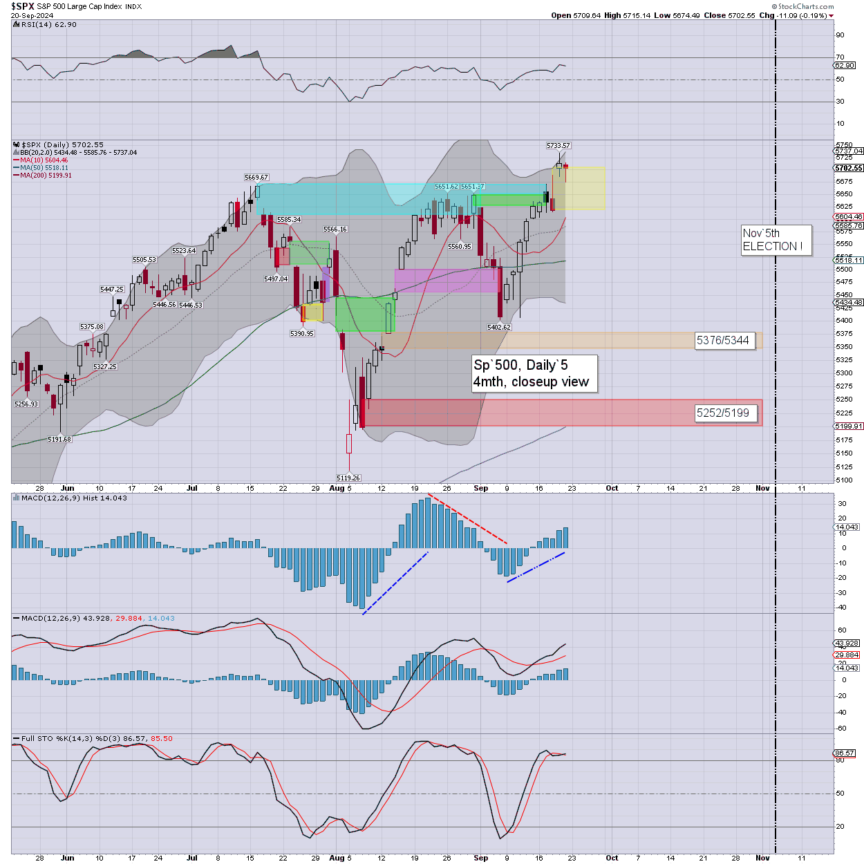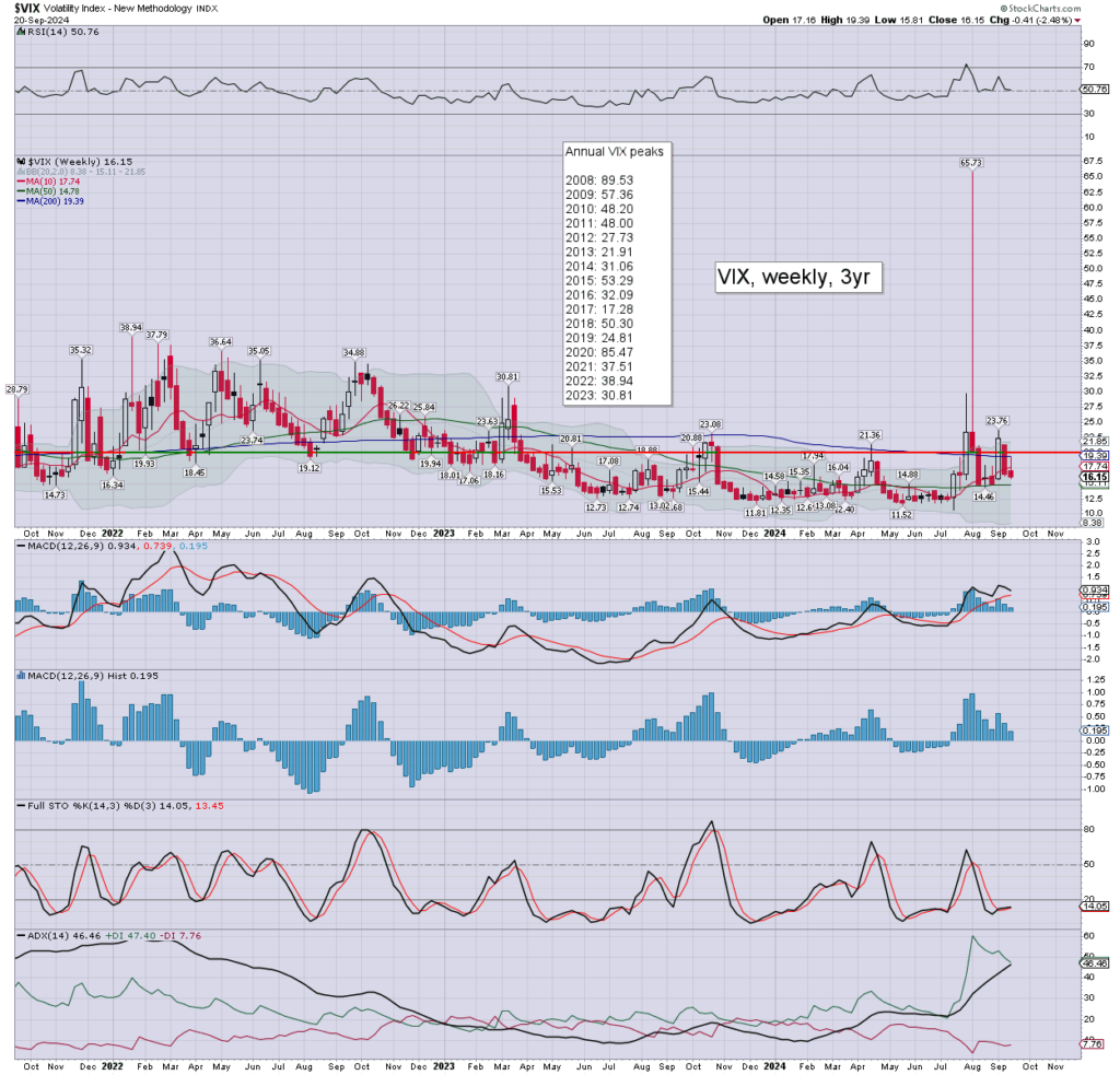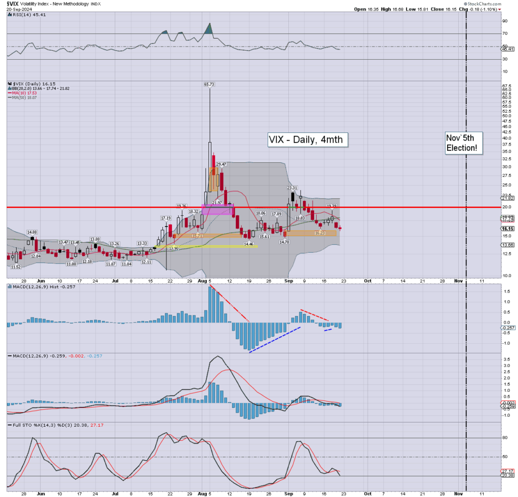 The VIX cooled for a second week by -2.5%. Weekly momentum ticked lower, and remains marginally positive. Upper bollinger offers the 21s. I have to expect >30 before the election, even if the SPX only cools back to (gap 3) of 5252/5199.