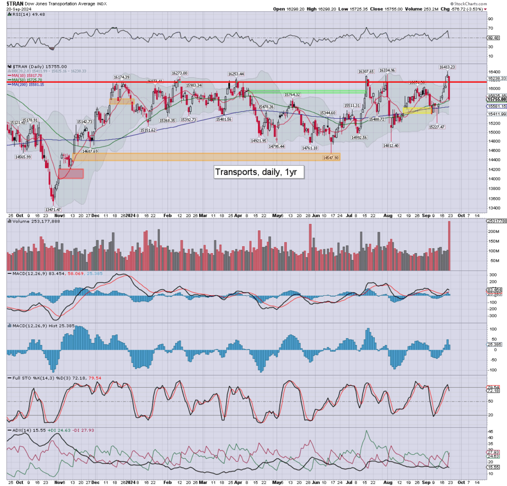 Trans: powerfully lower by -3.5% to 15755, skewed due to FedEx, and to a lesser extent by sister courier UPS. Today’s drop negates the marginal breakout. Bullish >16800, bearish <15K.