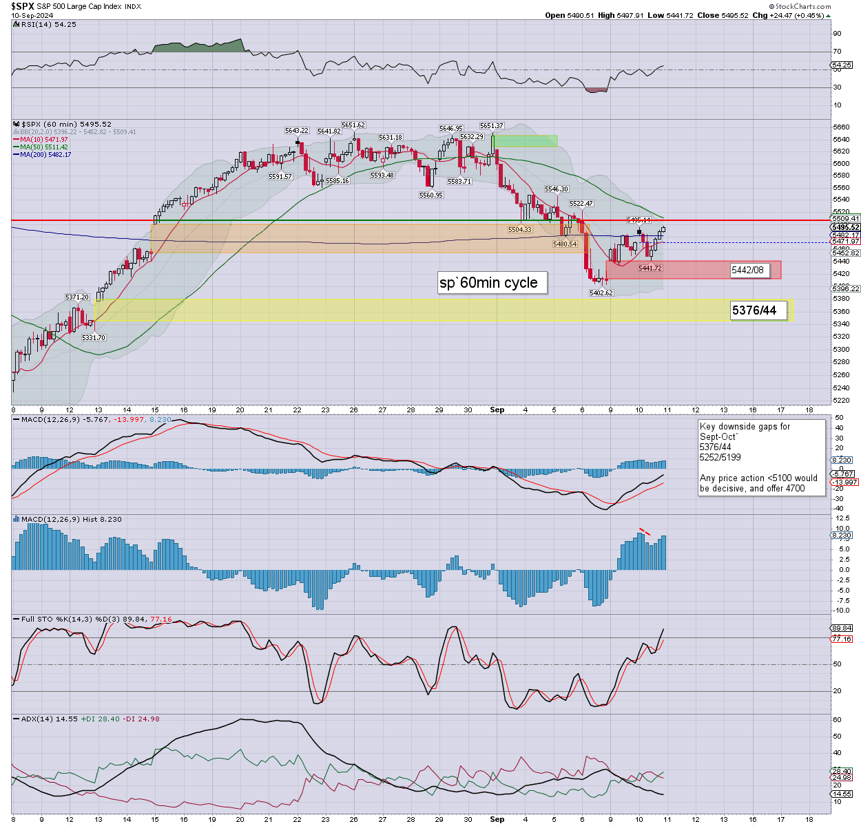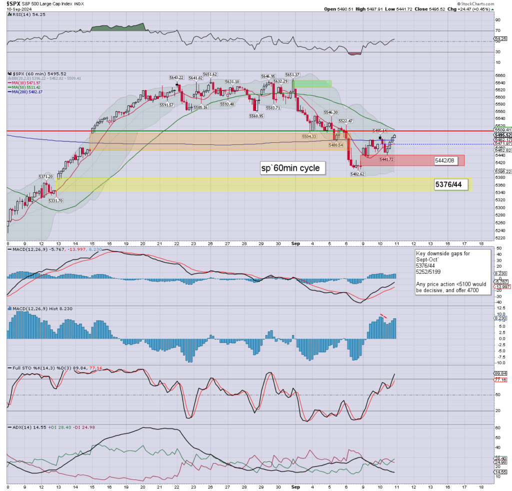 closing hour action: choppy, if leaning upward to break a new intraday high of 5497. S/t momentum ticked upward, settling on the high side.