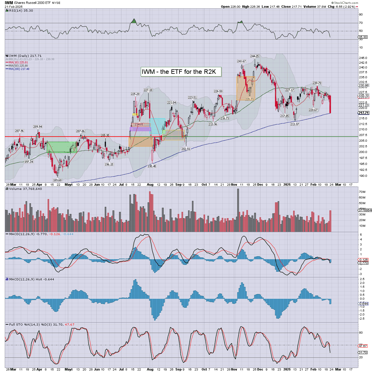 R2K: a third day lower, settling -2.9% to 217.71… on the 200dma. Today’s candle is bearish engulfing, and leans net bearish for Monday.