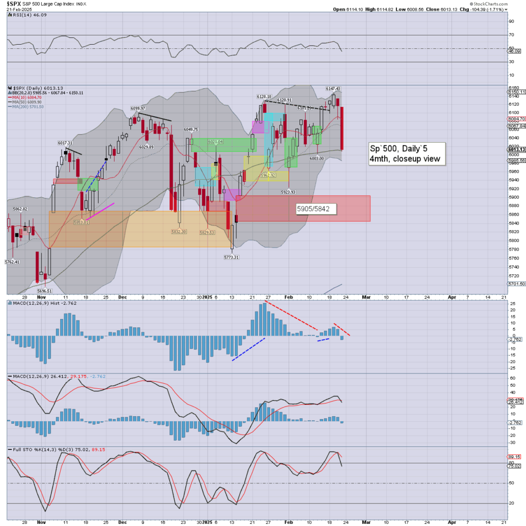 SPX: a second day lower, printing 6008, and settling -1.7% to 6013. Momentum turned negative. A daily close <6K would offer a tag of red gap.