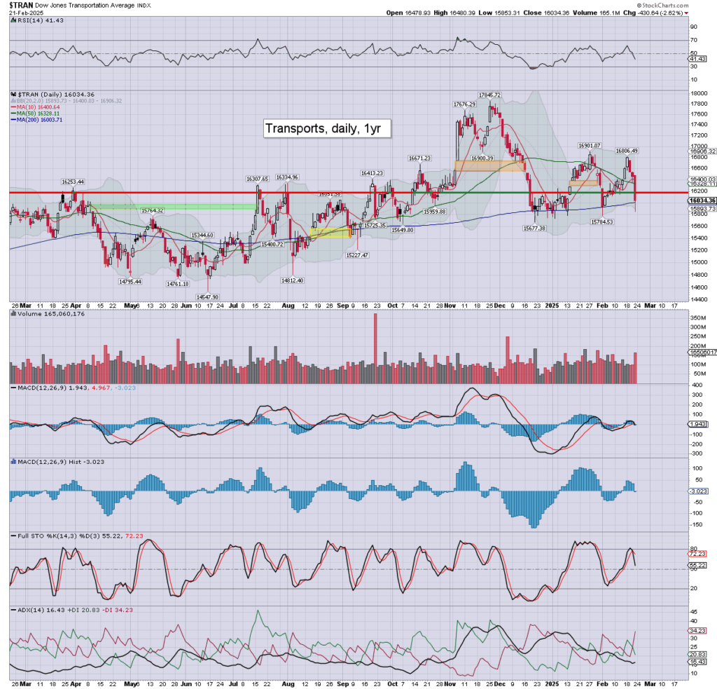 Trans: a third day lower, settling -2.6% to 16034, skewed by downside in FedEx (-5.3%). Today’s candle is spiky from around the 200dma.