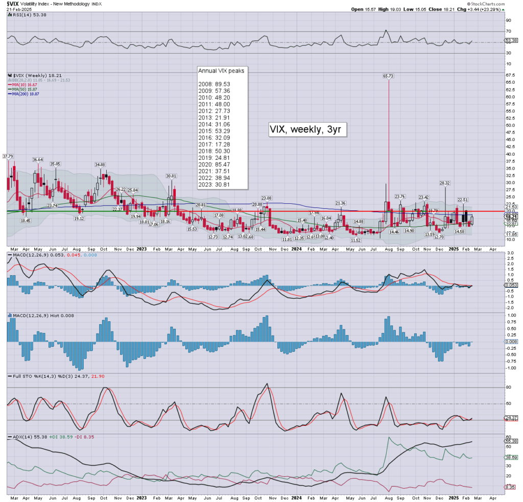 The VIX saw a net weekly gain of +23.3%. Weekly momentum has turned fractionally positive. Upper bollinger offers the 21s.
