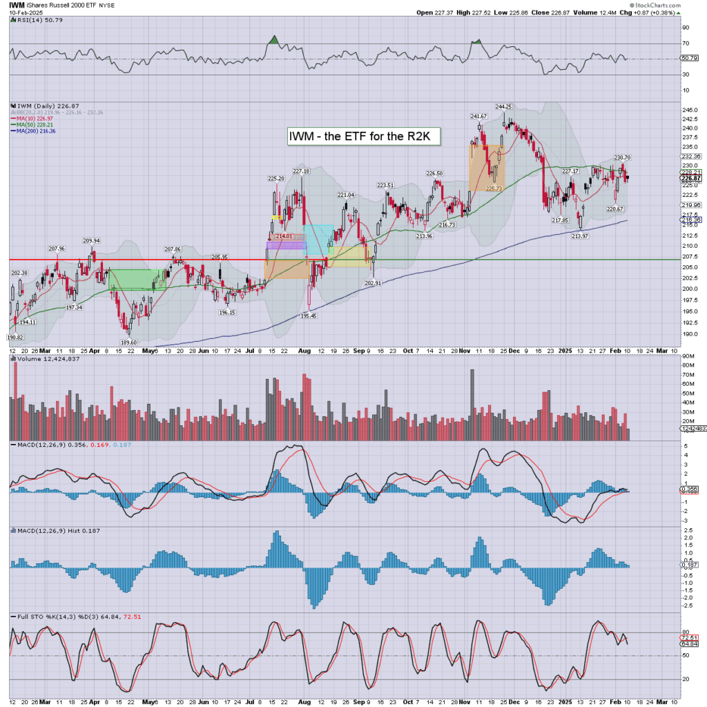 R2K: settling +0.4% to 226.87. Black candle. Daily momentum prone to turning negative within 1-2 days.