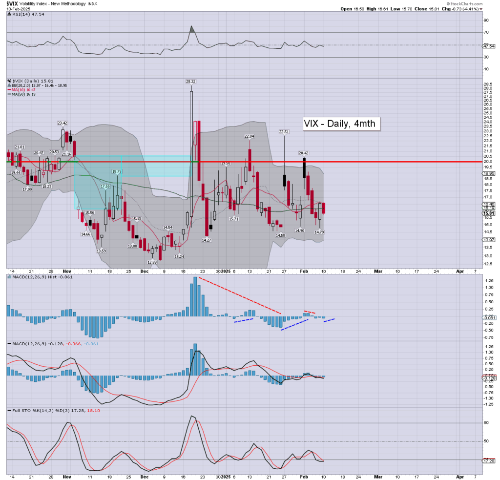 Volatility remained subdued, the VIX settling -4.4% at 15.81. Momentum ticked a touch lower, and remains fractionally negative. If SPX 5905… then VIX 19/20s, as looks realistic Wed’/Thurs’