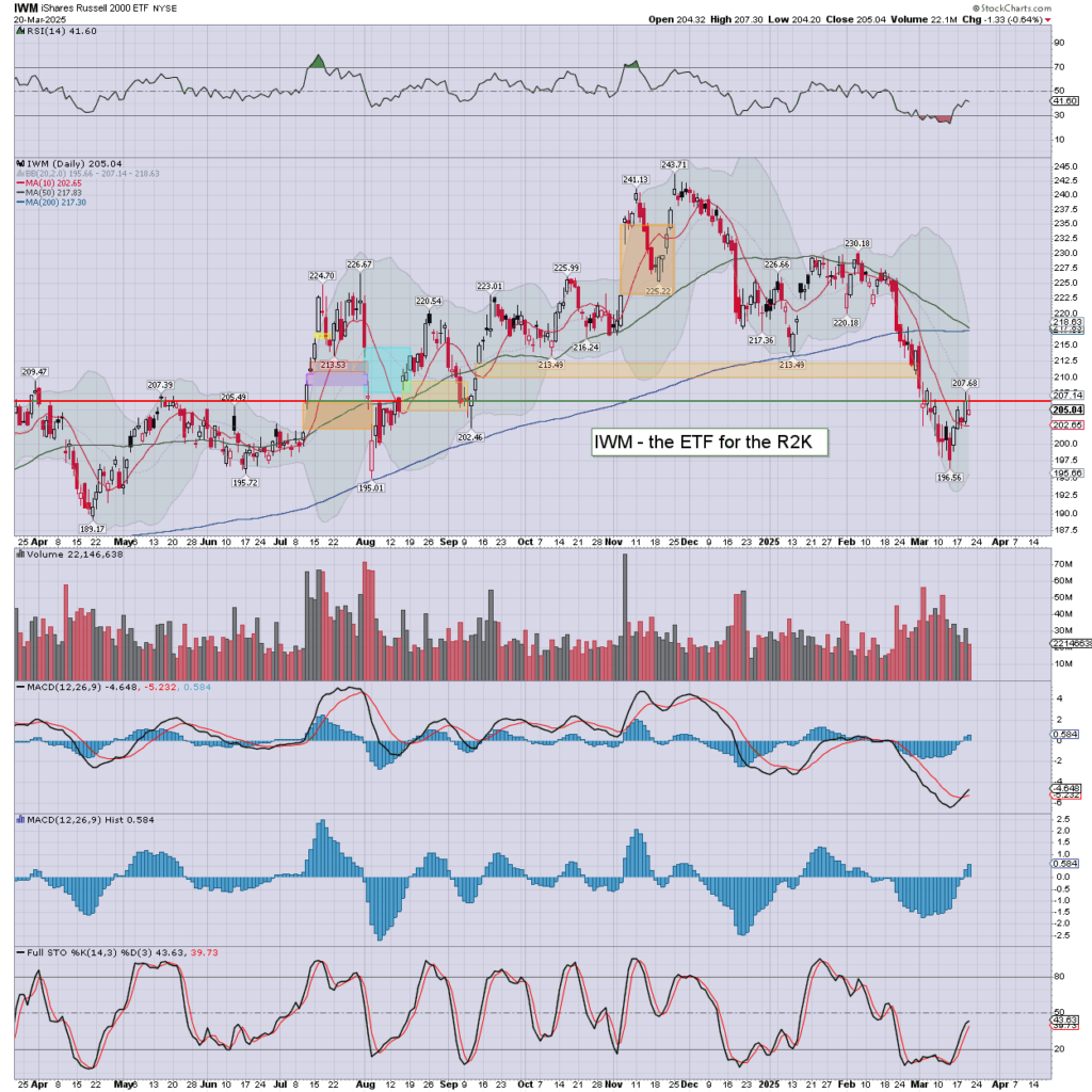 R2K: settling -0.6% to 205.04. Today’s candle is a hollow red reversal, and leans s/t bullish.