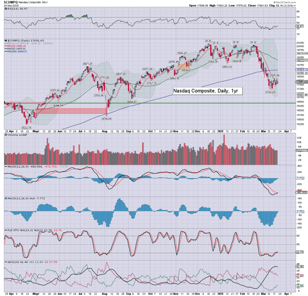 NAS: settling -0.3% to 17691. Today’s candle is a hollow red reversal, and leans s/t bullish.