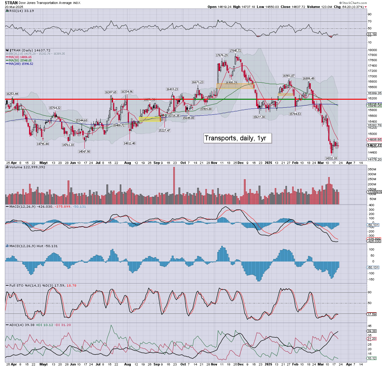 Trans: settling -0.4% to 14637. Today’s candle is a hollow red reversal, and leans s/t bullish.