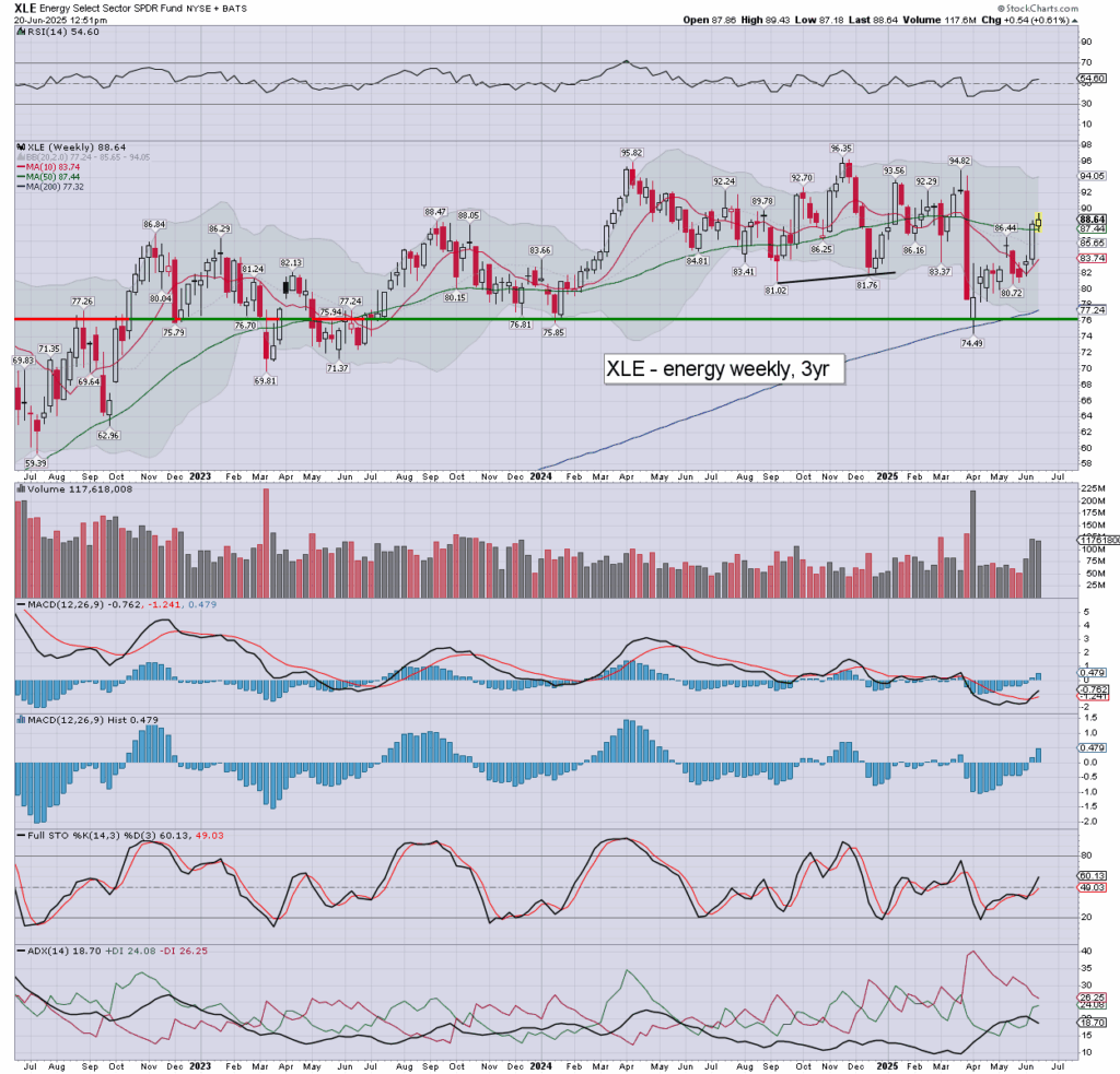 XLE: energy stocks are battling to build sig’ gains. The weekly charts lean net higher into July.