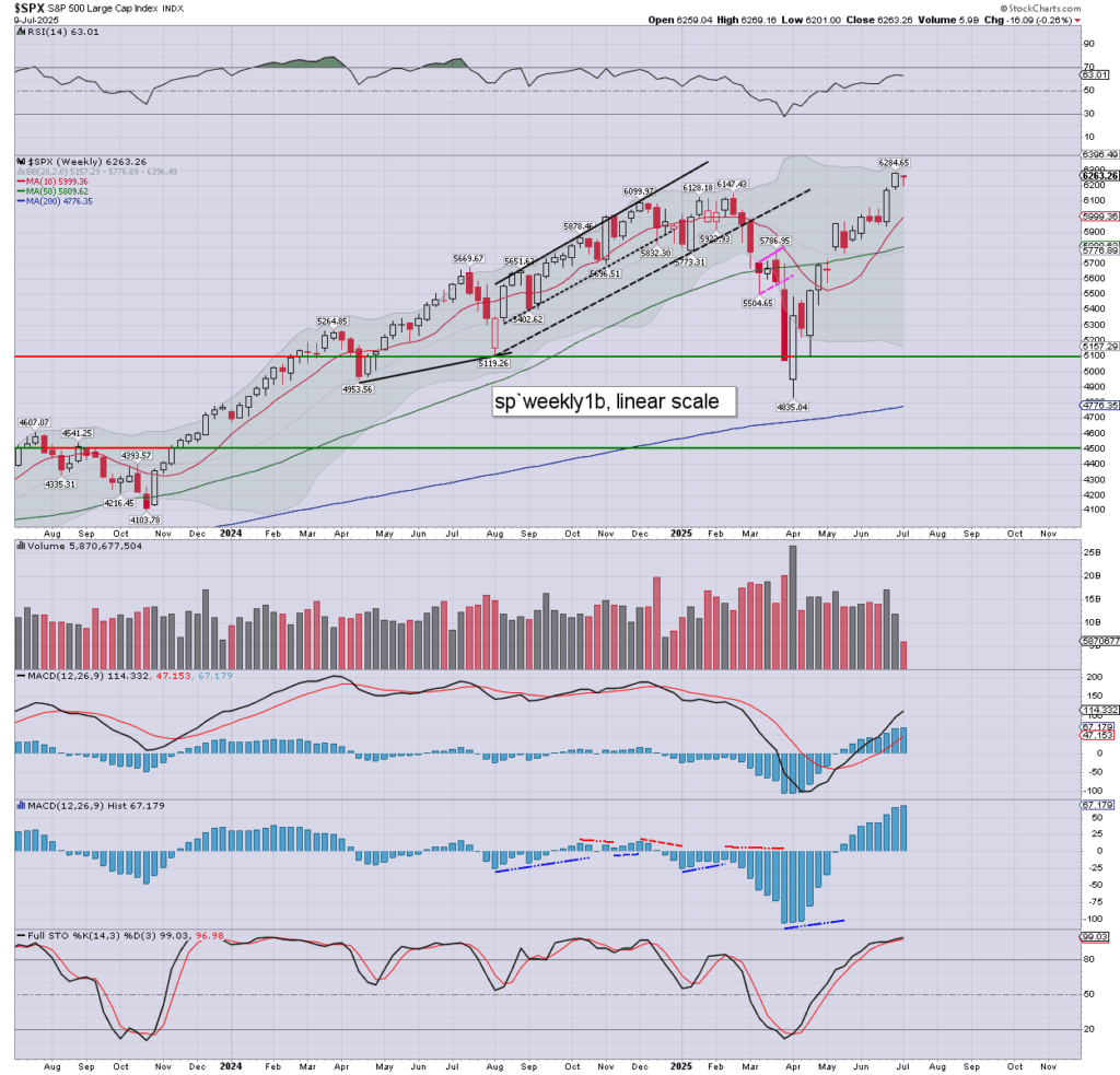 SPX: as things are, we’re net lower for the week by -16pts (0.3%). Weekly momentum is on the very high side. Bulls should be able to tolerate any cooling to around 6K. Upper bollinger is offering 6396.