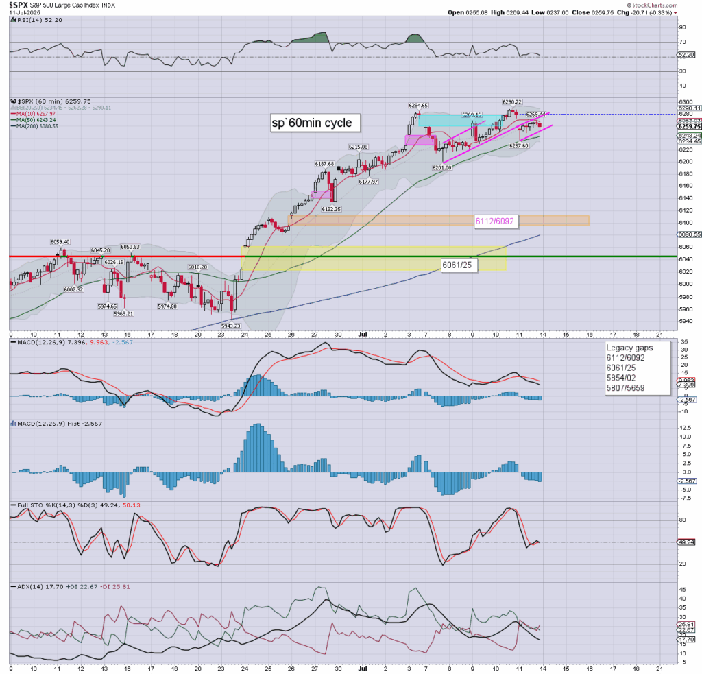 … and that concludes the week. A little weakness… but with a new hist’ high of 6290, it has to be seen as a net bullish week. The s/t cyclical setup favours the bulls, but structure is a bear flag.