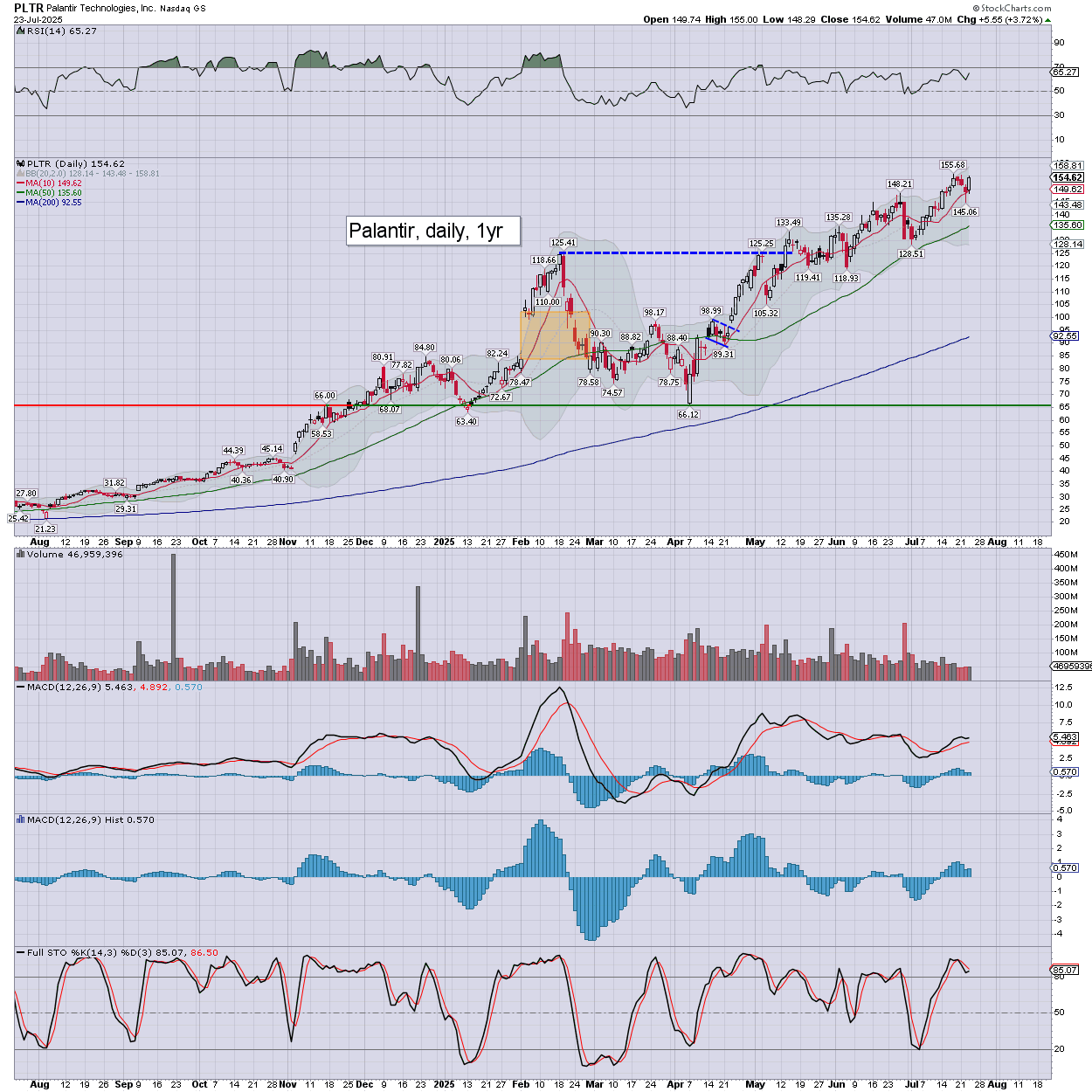 Palantir settled +3.7% to $154.62. Daily momo is marginally positive.