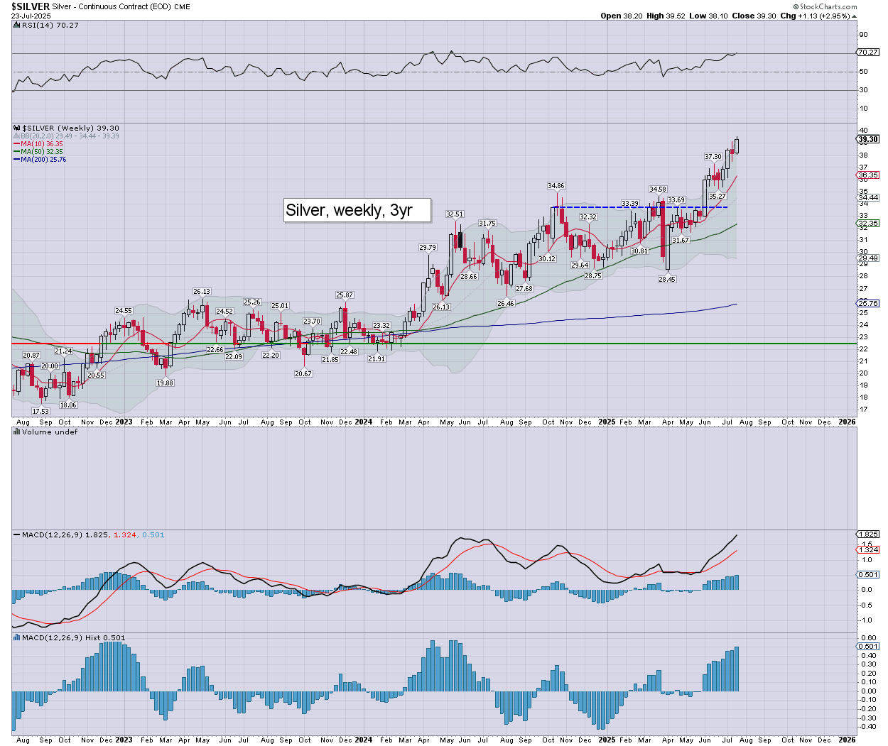 Silver today printed a new multi-year high of $39.52, if cooling back to $39.30.