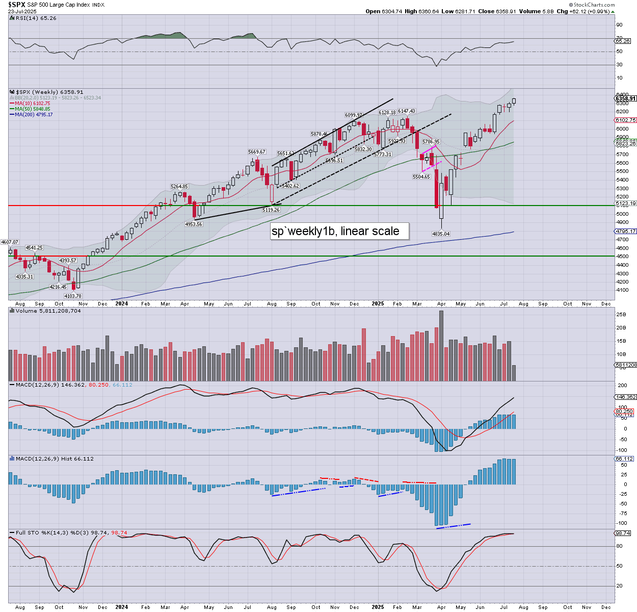 SPX: we’re currently net higher for the week by +62pts (1.0%). Weekly momentum is flat-lining on the very high side, and will remain positive until at least early Sept’. Upper weekly bollinger is offering the low 6500s, as look realistic mid August/early Sept’.